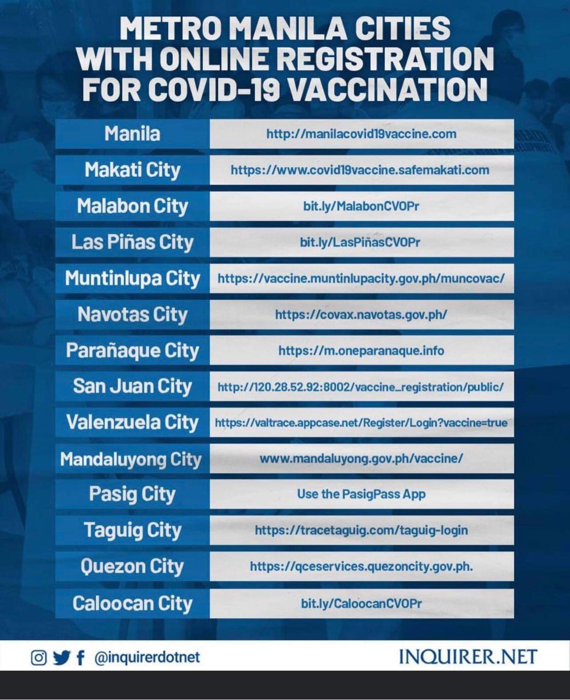 725,908 likes · 109,070 talking about this. Only 18 years and older will be vaccinated on scheduled dates. Just take note of which priority group will be served. Pangan, md, rsw, to the manila health department employees at city hall. Go to www.manilacovid19vaccine.com and click the blinking register or reserve button step 2.